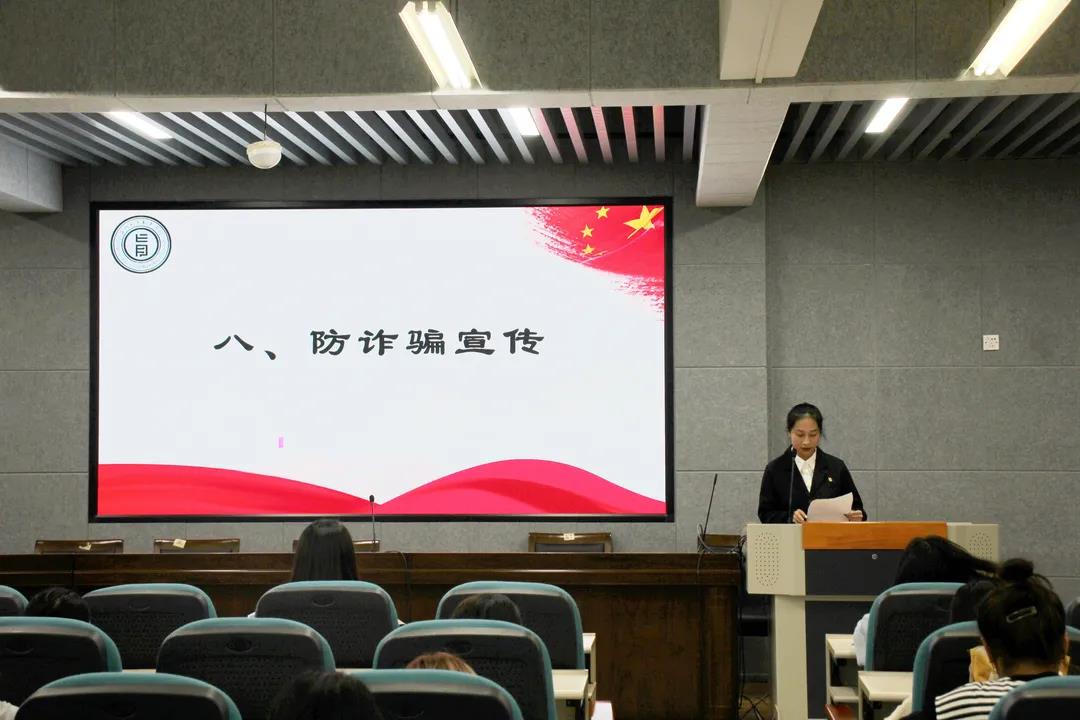 会议最后,为切实有效提升反诈防骗能力,增强师生的法治观念和安全防范意识,院团委、学生会组织部负责人傅柳蓉为大家带来安全教育和反诈防骗知识宣讲,讲述了如何识别网络诈骗以及有效的自我保护方法。她呼吁全体团支书召开主题班会,以案例讲解、观看“防诈反诈”短视频等形式,带领班级同学主动学习相关反诈教育知识,帮助同学们进一步提高安全防护意识。
