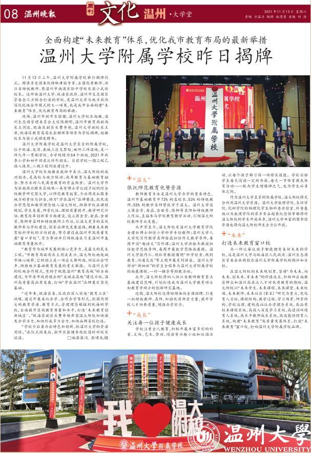 规划、学生发展、师资队伍、课程质量提升、教学研究评估、教育改革创新等方面建设,设立蒋金崇、俞磊、金丽芳、陈柳等名师和特级教师工作站,让温大更多的名优教师参与学校建设,探索品牌化发展道路,朝着未来教育标杆学校的方向前进,努力建设成温州市高质量发展“窗口学校”,有力带动并引领瓯海区乃至温州市基础教育质量跃升。