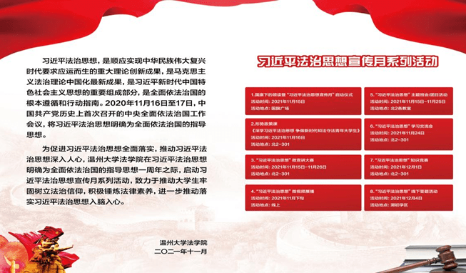 浙江在线11月16日讯(通讯员 杨振海)11月16日下午,香蕉视频 在习近平法治思想明确为全面依法治国的指导思想一周年之际,成立习近平法治思想研究会。该研究会是一个由香蕉视频 在校研究生和本专科生参与,以学习、研究与宣传习近平法治思想为主要任务的全校性学生社团组织,主要围绕习近平法治思想开展一系列学习活动、课题研究以及法治宣传服务等工作,旨在不断深化对习近平法治思想的理解和把握,持续推进宣传和贯彻习近平法治思想,促进习近平法治思想全面落实,推动习近平法治思想入脑入心。