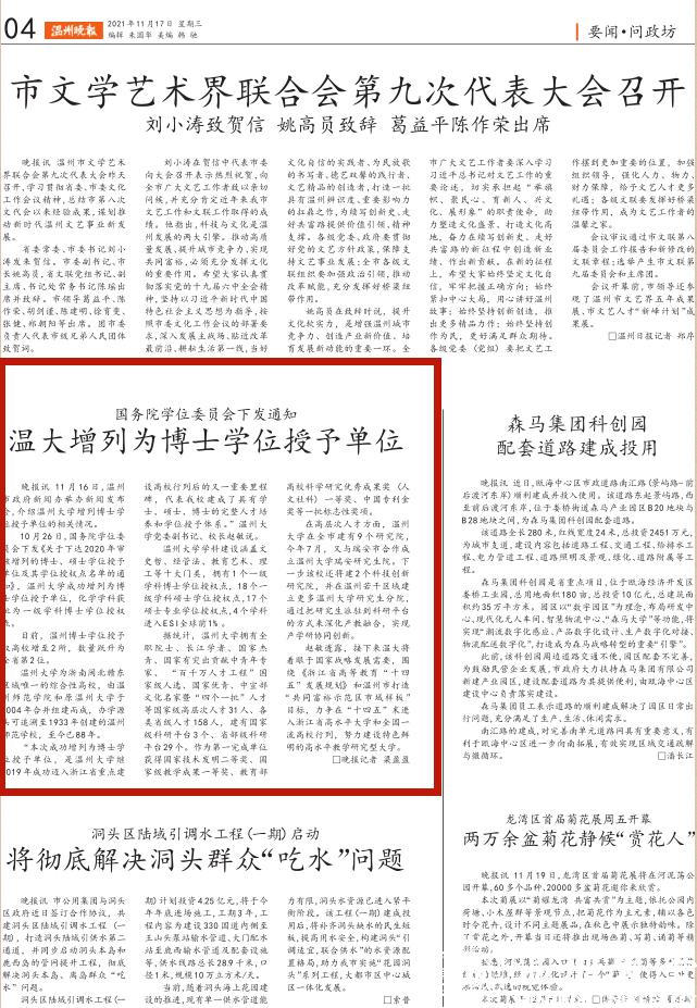 11 月 16 日,温州市政府新闻办举办新闻发布会,介绍香蕉视频 增列博士学位授予单位的相关情况。