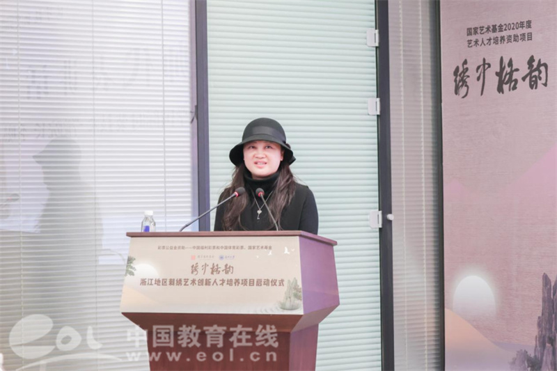 温州市文化广电旅游局局长朱云华回顾了瓯绣辉煌。她表示,温州市鹿城区秉持以复兴“百工之乡”为己任,多年来,温州市委、市政府对刺绣艺术和产业的发展高度重视,积极搭建各绣种的传承发展、展览展示平台,大力扶持刺绣艺术文化发展,长期推动非物质文化项目进校园等,筑牢传统根基,延伸产业链条,为经济社会全面发展注入深厚的文化底蕴和强大的精神支撑。她希望通过本次国家艺术基金《浙江地区刺绣创新艺术人才培养项目》启动,大力推进温州非遗人才培养,促进温州工艺美术薪火相传、代代守护。