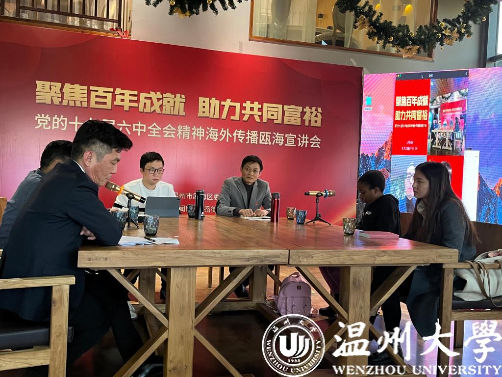 近日,我院葡萄牙籍留学生陈梦瑶、尼日利亚籍留学生金微微作为留学生代表参加了在瓯海区丽岙街道五社村文化礼堂举办的党的十九届六中全会精神海外传播瓯海宣讲会。本次宣讲会由瓯海区委宣传部举办,以直播的方式进行。全场共吸引了33万海内外华人华侨收看。