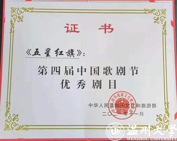 由文化和旅游部、山东省人民政府主办,文化和旅游部艺术司、山东省文化和旅游厅,济南、青岛、淄博、烟台、潍坊、临沂、德州市人民政府承办的第四届中国歌剧节,共组织了24部优秀歌剧作品演出展示。歌剧《五星红旗》作为唯一一个综合性院校入围,于10月17、18日在山东临沂大剧院连演两场,社会反响热烈,“线下+线上”观看近500万人次。最终,获评第四届中国歌剧节优秀剧目奖。