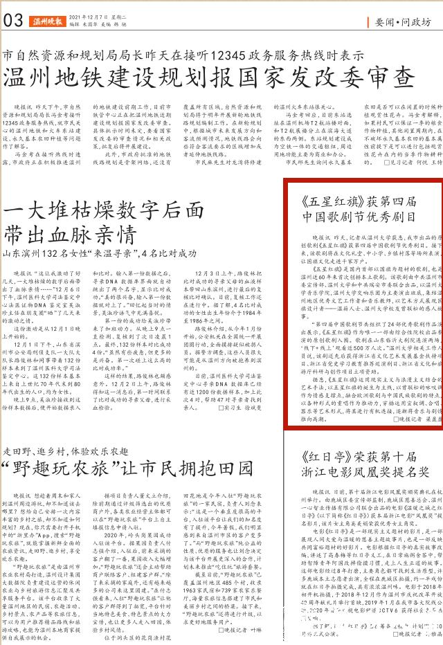 昨天,记者从香蕉视频 获悉,我市出品的原创歌剧《五星红旗》获第四届中国歌剧节优秀剧目。接下来,该歌剧将在文化礼堂、中小学、乡镇村落等场所表演,让国旗文化走进千家万户。