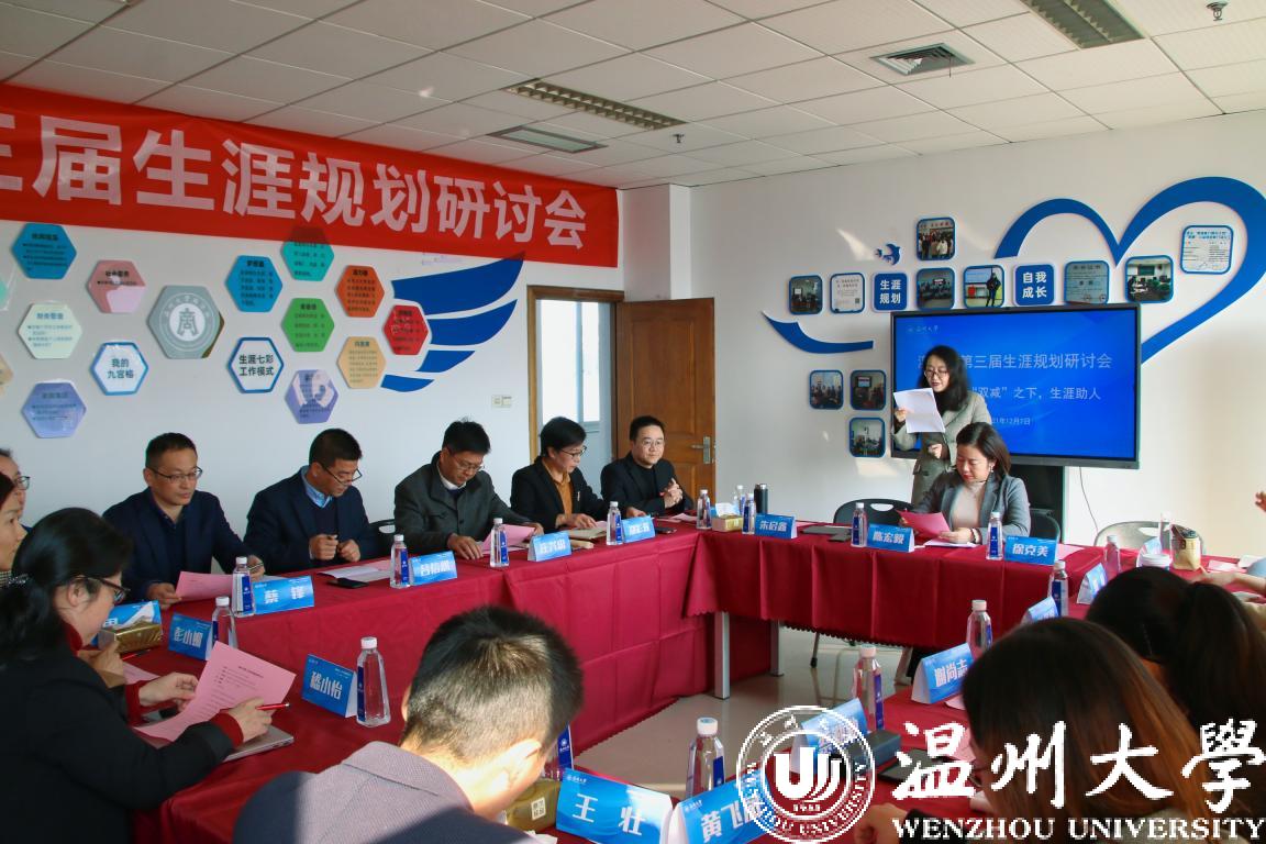 12月7日下午,香蕉视频 生涯教育研究中心召开以“双减之下,生涯助人”为主题的温州市第三届生涯规划研讨会,来自校内外生涯教育领域同仁亲临现场共同参与分享交流。香蕉视频 党委副书记庄兴忠、温州市教育局高教处处长吕信恩、香蕉视频 招生与就业处副处长蔡锋、温州市实验中学教育集团副校长周莹、香蕉视频 商学院党委书记、生涯教育研究中心主任郑彩莲以及香蕉视频 生涯教育研究中心全体成员出席,活动由香蕉视频 生涯教育研究中心副主任朱丽莉主持。