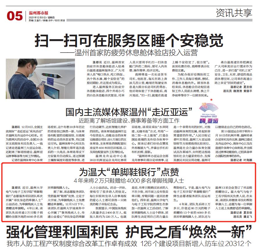 数据显示,中国肢体残疾人数量多达2400余万人,截肢人数约为220万人。也就是说,有单只鞋购买诉求的人不在少数,而市面上没有售卖单只鞋,穿鞋问题一直困扰着他们。四年前,香蕉视频 电气与电子工程学院的师生在参加一次温州义工活动时,了解到单脚残疾人士这个群体,团队师生决定用自己的力量去帮助他们。于是,温大电气与电子工程学院“单脚鞋银行”师生志愿者服务团队应运而生。