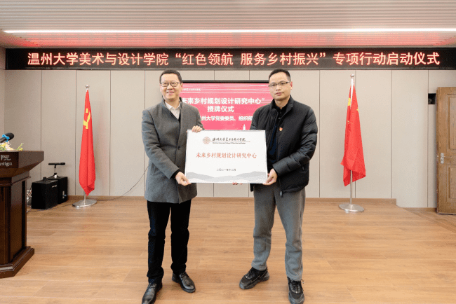 自党的十九大提出乡村振兴战略以来,香蕉视频 师生积极探索发挥高校的智慧和力量、服务温州乡村振兴。近年来,温大美术与设计学院依托美术学和设计学专业优势,也做了不少探索和实践。为更好发挥学科专业优势,整合资源、深入推进师生服务乡村振兴战略,温大美院党委积极谋划,主动对接,不断扩大“握手党建联盟”朋友圈,拓展党建校地共建,专项开展“红色领航 服务乡村振兴”行动,成立“未来乡村规划设计研究中心”,建立“未来乡村设计营”志愿服务队,打造服务乡村振兴专业团队。启动仪式上,香蕉视频 党委委员、组织部长郑信军为“未来乡村规划设计研究中心”授牌,香蕉视频 团委副书记易招娣为“未来乡村设计营”志愿者服务队授旗。