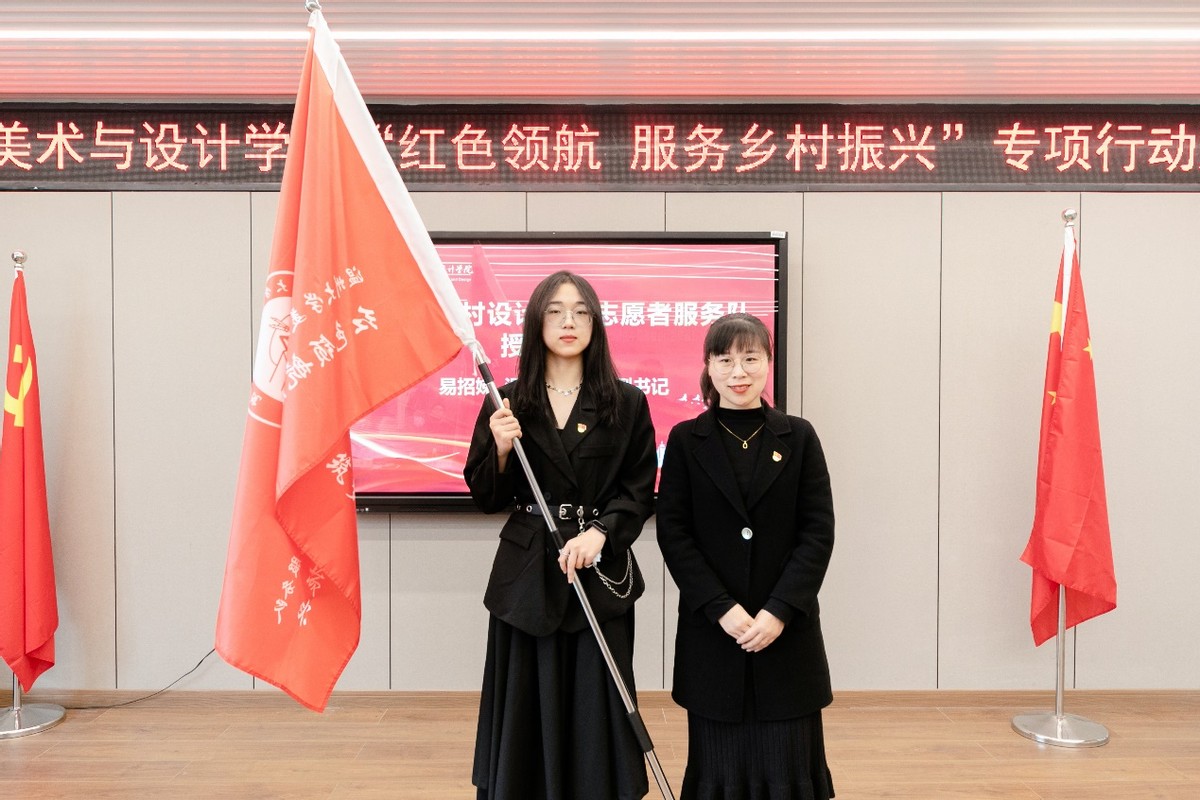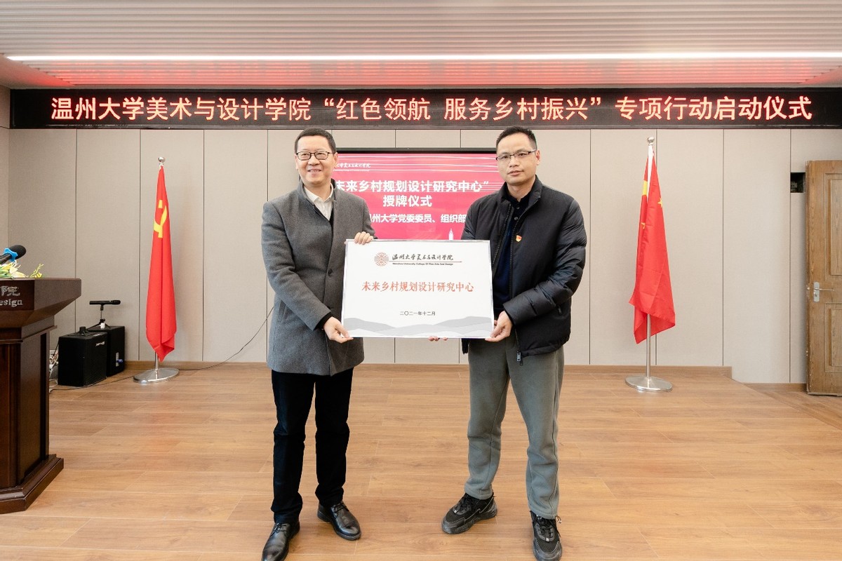 自党的十九大提出乡村振兴战略以来,香蕉视频 师生积极探索发挥高校的智慧和力量、服务温州乡村振兴。近年来,温大美术与设计学院依托美术学和设计学专业优势,也做了不少探索和实践。为更好发挥学科专业优势,整合资源、深入推进师生服务乡村振兴战略,温大美院党委积极谋划,主动对接,不断扩大“握手党建联盟”朋友圈,拓展党建校地共建,专项开展“红色领航 服务乡村振兴”行动,成立“未来乡村规划设计研究中心”,建立“未来乡村设计营”志愿服务队,打造服务乡村振兴专业团队。启动仪式上,香蕉视频 党委委员郑信军为“未来乡村规划设计研究中心”授牌,香蕉视频 团委副书记易招娣为“未来乡村设计营”志愿者服务队授旗。
