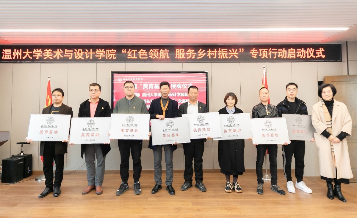 来自文成周山、瓯海丽岙、洞头霓屿、苍南马站、永嘉鹤盛、泰顺雅阳、平阳湖屿、苍南赤溪等8个县市区乡镇的有关负责人出席专项行动启动仪式,温大美院院长谢子静为其颁发“美育基地”牌子,开启校地党建共建的友好之旅,也为温大美院深入开展社会美育开辟了重要途径。