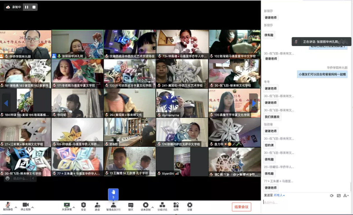 学员们对于张老师的剪纸作品都非常感兴趣,纷纷表示想自己亲手制作一个送给家长和西班牙的同学们、教他们学中华剪纸、邀请他们一起看北京冬奥会。张老师亲手演示了雪花剪纸的制作方法,还将剪制作品的方法和重点在课后分享至学员群内,以便同学们在课后能够反复观摩练习。