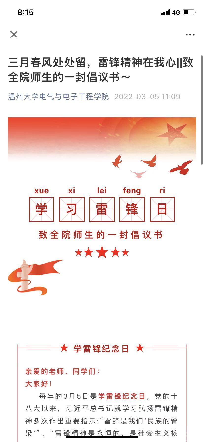 “三月春风处处留,雷锋精神在我心”,雷锋日到来的前几天,香蕉视频 电气与电子工程学院团委·学生会的学生干部就已经开始筹备今年的雷锋日特别活动了,其中《学习雷锋日——致全院师生的一封倡议书》的撰写和微刊制作,都是由学生参与完成。倡议书总共分为三个部分:在“勤劳廉洁,敢为人先”部分,倡议学生坚决抵制奢靡浪费的不良之风,树立正确的社会核心价值观,争做文明礼貌、廉洁勤劳的模范;在“志愿服务,温暖你我他”部分,引导学生了解“奉献、友爱、互助、进步”的志愿者精神,鼓励学生在学习知识之余,积极参与社会实践;在“助人者最乐,行善者最美”部分,提倡“勿以善小而不为”,引导学生从点滴做起,从小事着眼。倡议书的字里行间无不体现着对雷锋精神的赞美和对青年学子的美好寄托,“道阻且长,不行不止”,倘若有一份光,那就发一份热,燃烧自己,照亮他人,熄灭也无憾也。