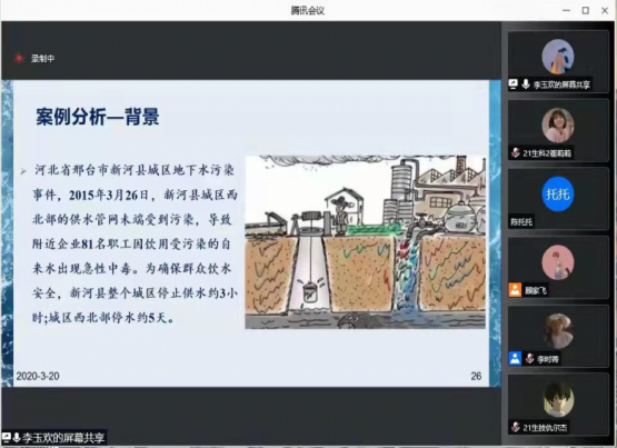 “人多水少、水资源时空分布不均是我国的基本国情和水情,水资源短缺越来越成为制约我国经济社会发展的瓶颈制约。”宣讲员们分3场利用腾讯会议向350余位同学介绍我国地下水的现状、法律法规及实际案例等内容,使同学们对地下水有所了解,在今后的生活中珍惜隐藏的地下水。