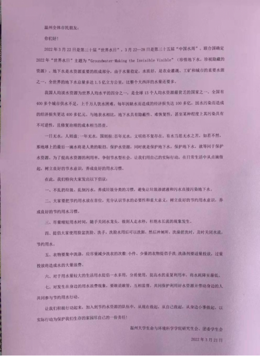 “一日无水,人则虚;一年无水,国则损;百年无水,文明将不复存在。有水当思无水之苦,如若不然,那地球上的最后一滴水将是人类的眼泪......”,生环学子利用新媒体向全市民众发出一封倡议书,呼吁大家用自己的实际行动,在日常生活中从点滴做起,树立良好的节水意识,养成良好的用水习惯。