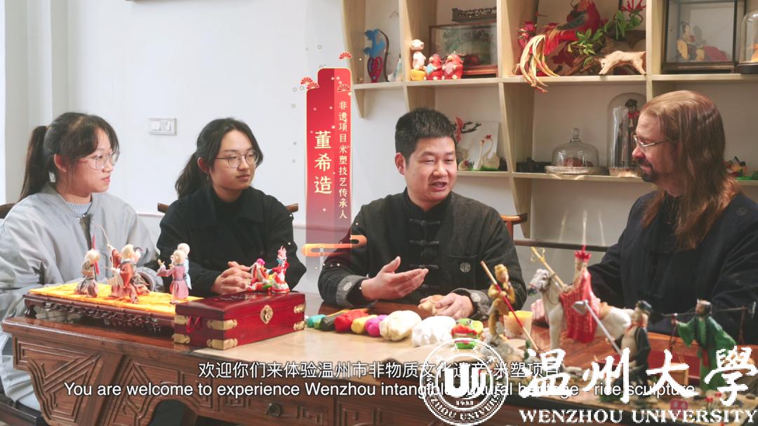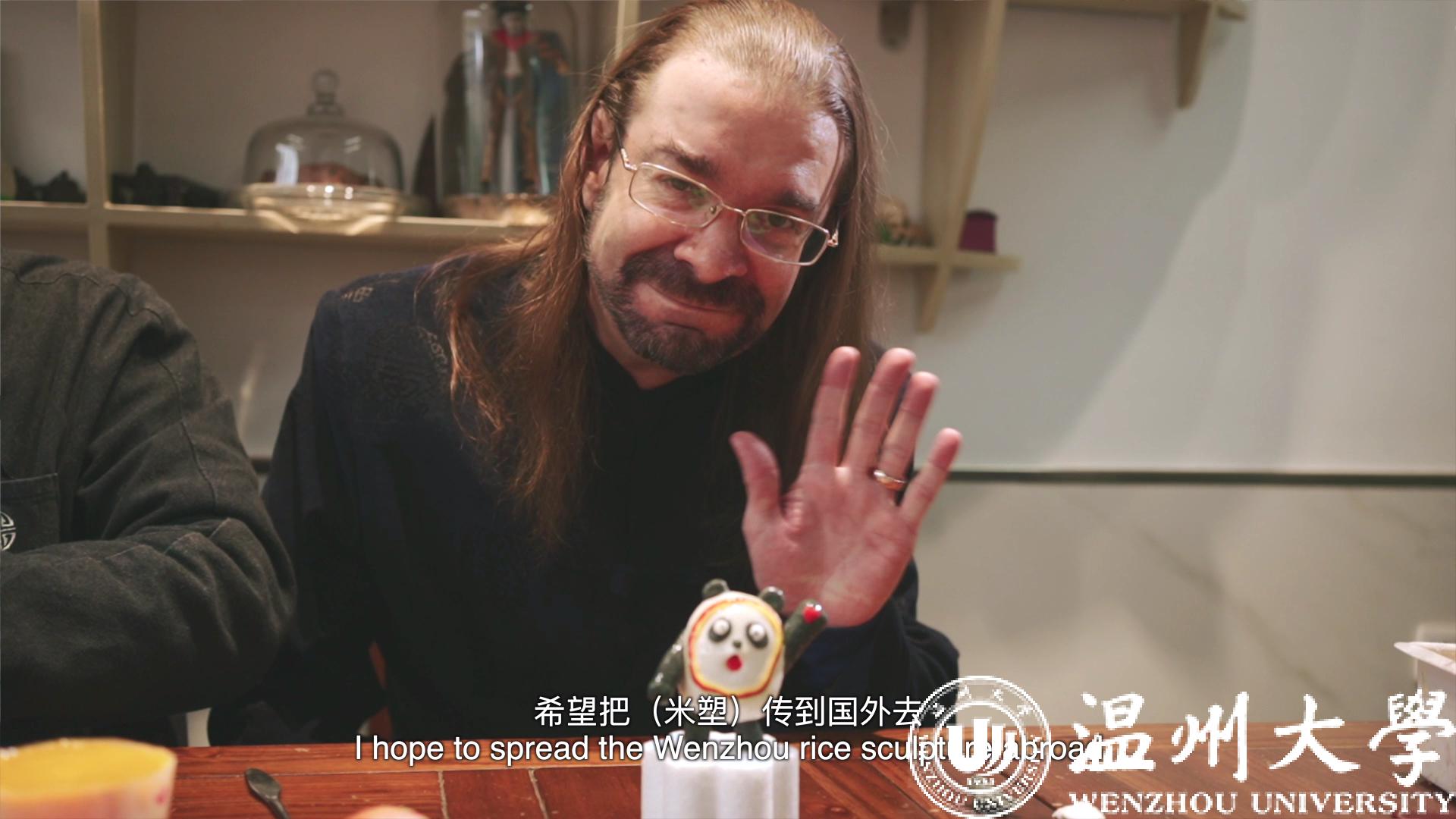 Craig(张镭)说,在温州,他接触过很多“真生活”的非物质文化遗产,如发绣技艺、木拱廊桥等。但如此近距离体验米塑,还是第一次。据省级非遗项目米塑传承人董希造老师介绍,从简单的花鸟鱼虫,到复杂的人物塑像,从人物面部神态,到衣服褶皱,每一处都体现着工匠精神,米塑技艺的养成可不是一朝一夕的,需要时间的积淀。而在董希造老师的工作室内,一排米塑的冰墩墩,让Craig(张镭)惊叹不已,“我就算练上1000年也做不出这样的作品!”