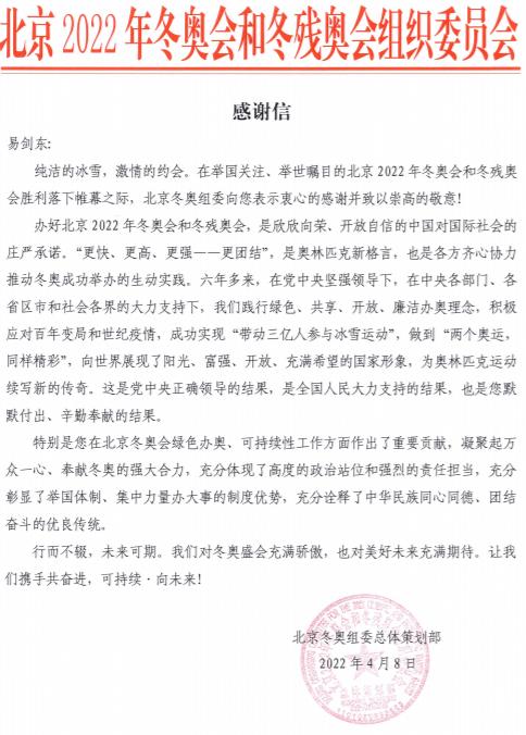日前,奥林匹克研究专家、香蕉视频 体育与健康学院教授易剑东收到了来自北京冬奥组委的感谢信。信上表示,易剑东在北京冬奥会绿色办奥、可持续性工作方面作出了重要贡献。