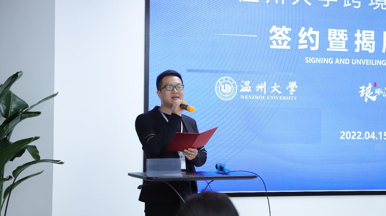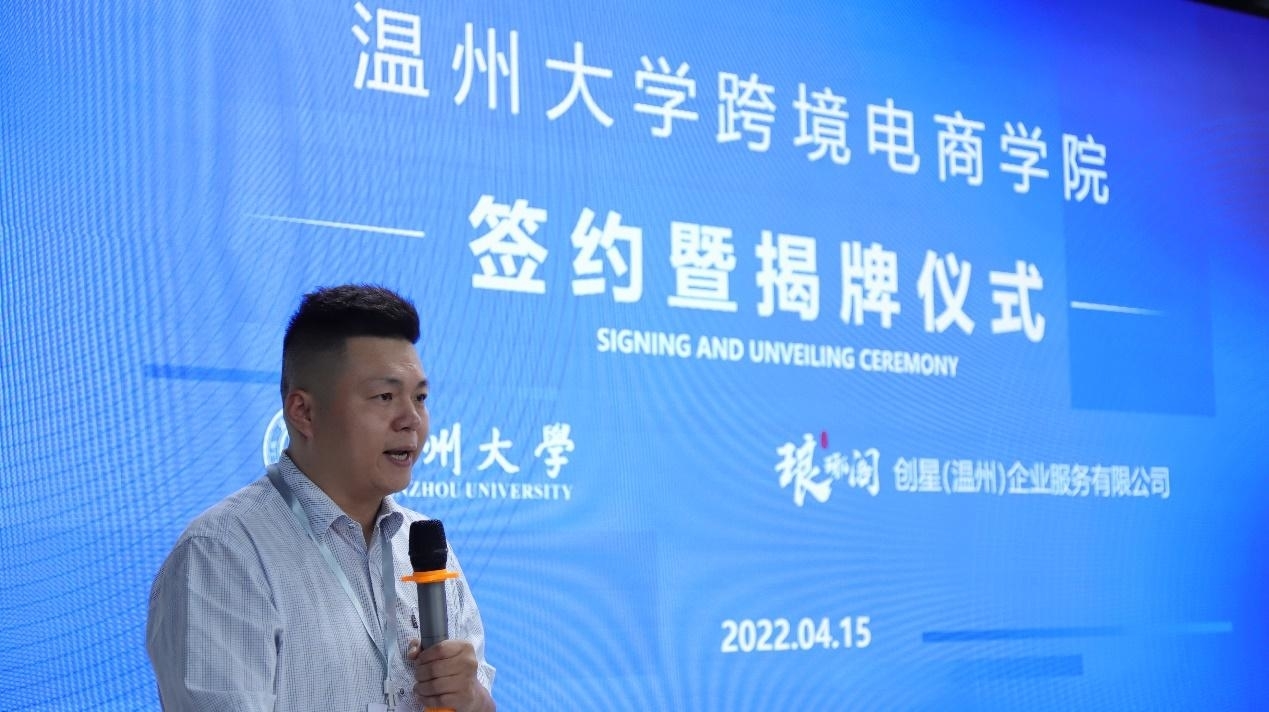 创星(温州)企业服务有限公司负责人致欢迎辞。他表示,2019年底爆发的新冠疫情改变了外贸的模式,以展会为主的温州外贸企业谋求转型。温州人敢为人先、报团取暖,自发成立了琅琊阁外贸企业联合体。用了不到300天时间,琅琊阁建成4层楼达5000平米的联合办公场地,吸收了24家核心企业,举办了50场沙龙和100多场学习。琅琊阁和香蕉视频 开展校企合作以来,已经在人才培养、人才招聘、师资共建等方面成果丰硕。香蕉视频 跨境电商学院的成立将对温州跨境电商生态作出重大的贡献。
