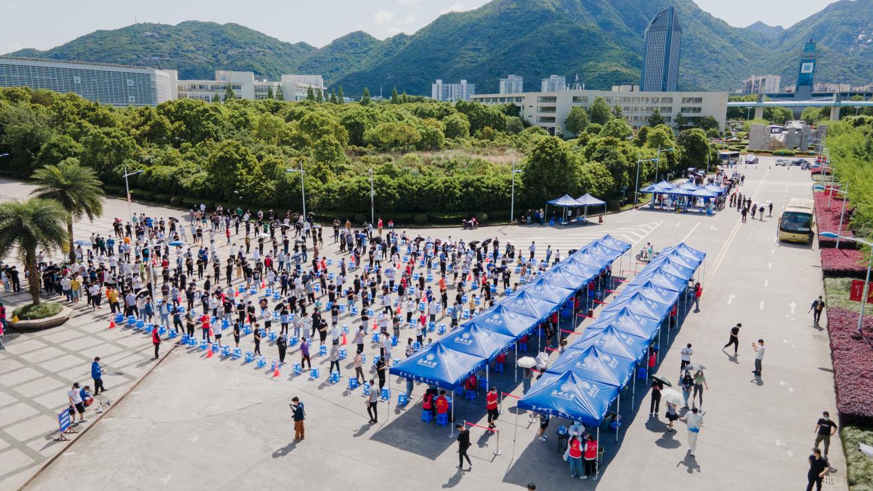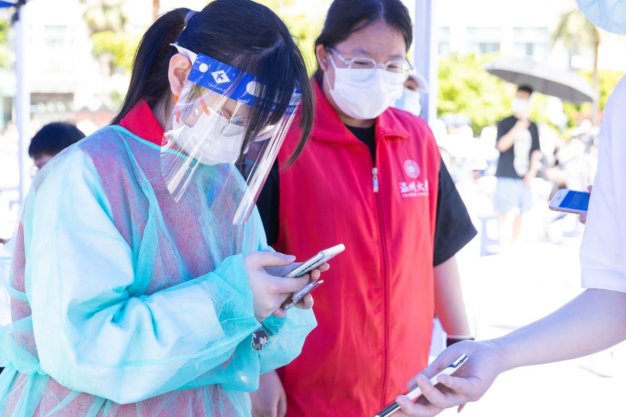 酸检测志愿服务中,志愿者身披红马甲穿梭于人群之中,为前来检测的师生和教职工提供排队最优解,在太阳的暴晒下,志愿者耐心提醒广大师生戴好口罩、打开温州防疫码并按照要求隔开1米距离。与此同时,负责协助核酸检测医护人员的志愿者穿起防护服,为核酸人员提供登记服务,减轻医护人员负担,加快核酸检测进程。本次全员核酸检测工作时间紧、任务重,但各方人员顶住压力,以四个小时就完成全部任务、不落一人的工作进度动态展现了“温大速度”。这四个小时,离不开我们医护人员的坚守,离不开工作人员的尽心尽责,更离不开青年志愿者的鼎力相助。
