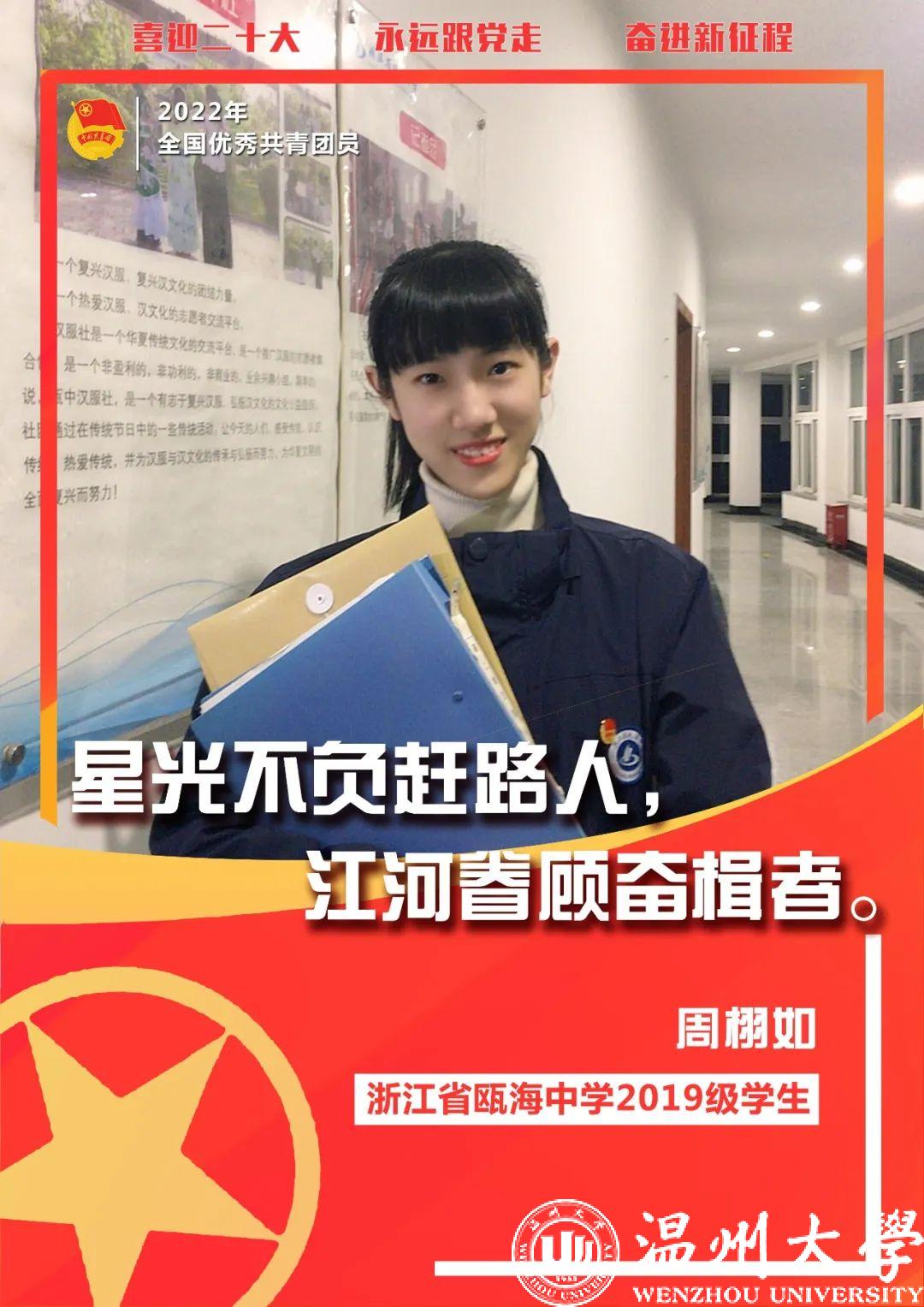 周栩如来自浙江省瓯海中学,作为一名“00后”共青团员,她担任着校团委副书记、学生会副主席。任职期间,她组织开展德育特色班创建活动,创设“红色情景剧”党课学习模式并产生了良好的社会反响,市教育局期刊《学生时代》将她列为学生成长的榜样。她还是共青团温州市第十七次代表大会代表、市“激扬新时代温州人精神”青年讲师团讲师。她先后荣获教育部“宋庆龄奖学金”、“省级美德少年”“全国四星雏鹰奖章”“市优秀共青团员”等荣誉,并夺得省“青少年DI创新思维大赛”特等奖。