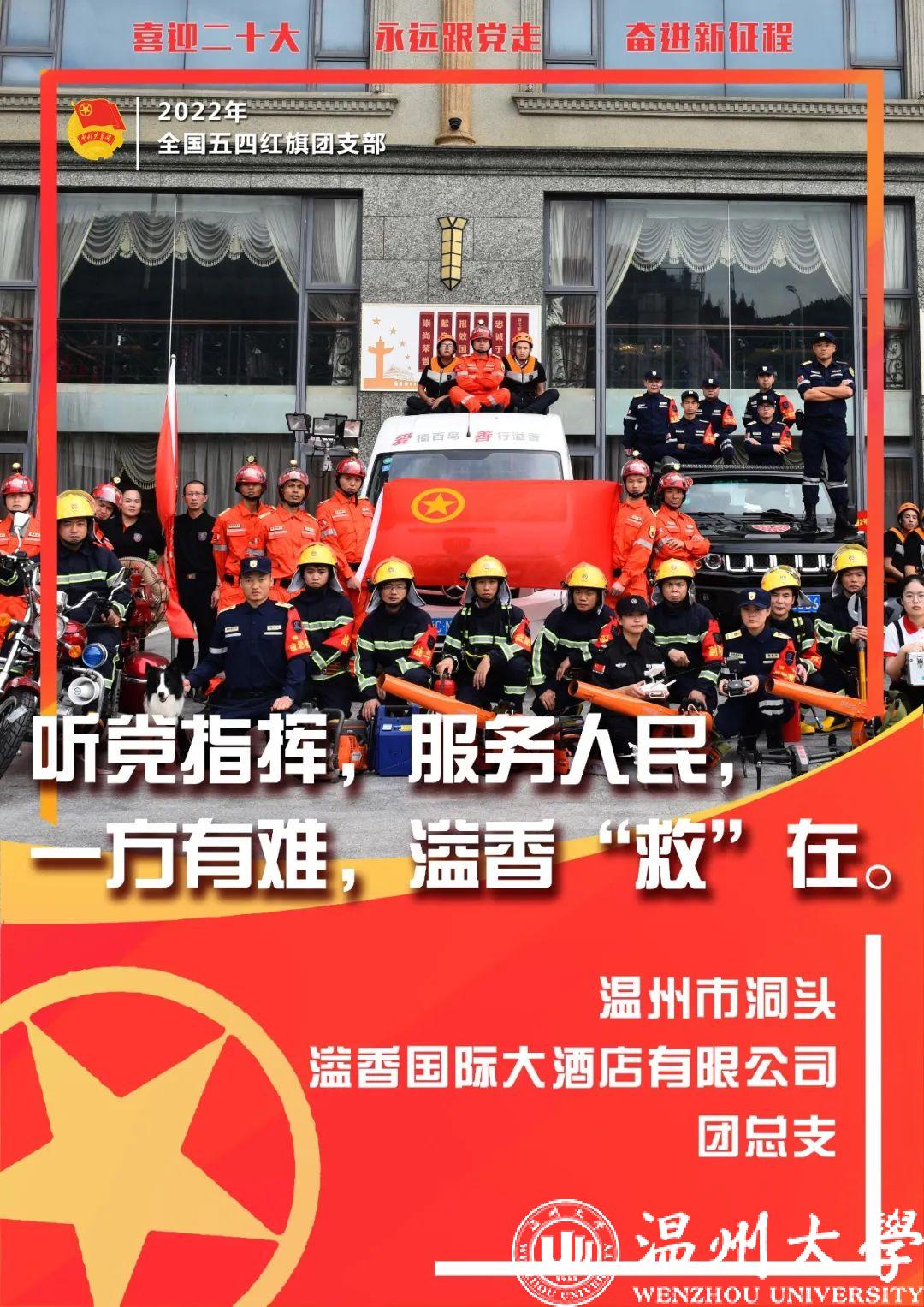 温州市洞头溢香国际大酒店有限公司团总支成立于2017年12月,是一支热心于公益慈善事业的青年志愿者队伍,连续6年举办溢香爱心慈善宴,将全区的清洁工、孤寡老人、残疾人、低保户等请进酒店品尝美味佳肴。他们积极参与疫情防控工作,帮助义务消杀5157户,累计分发宣传资料2000余份,送出快餐1500余份。他们成立溢香应急救援队,开展海上救援25次、协助消防灭火19次,为本地民众解决了当务之需。先后荣获温州市“最美志愿者”集体、浙江省“成绩突出团(总)支部”称号等荣誉。