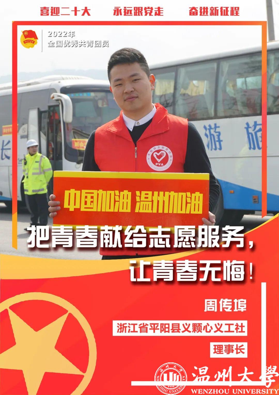周传埠是一名基层青年公益人,2016年他成立义颗心微公益组织,2018年正式注册成立平阳县义颗心义工社,先后组织或协办了400多场公益活动,其中,义点星光公益融合课堂,是一个关爱和陪伴自闭症儿童的项目,为当地自闭症儿童提供音乐、美术、手工等趣味拓展课程。疫情期间,他带领“义颗心”的志愿者们奋战在抗疫一线,为隔离点特殊人员送爱心餐以及为工作人员运送物资等。他先后荣获最美温州人、浙江省志愿服务工作先进个人等荣誉,他总说自己很平凡,所做的事情也只是比“力所能及”多一点点而已。如今,在他的带动下,越来越多青年加入了义颗心志愿者队伍。