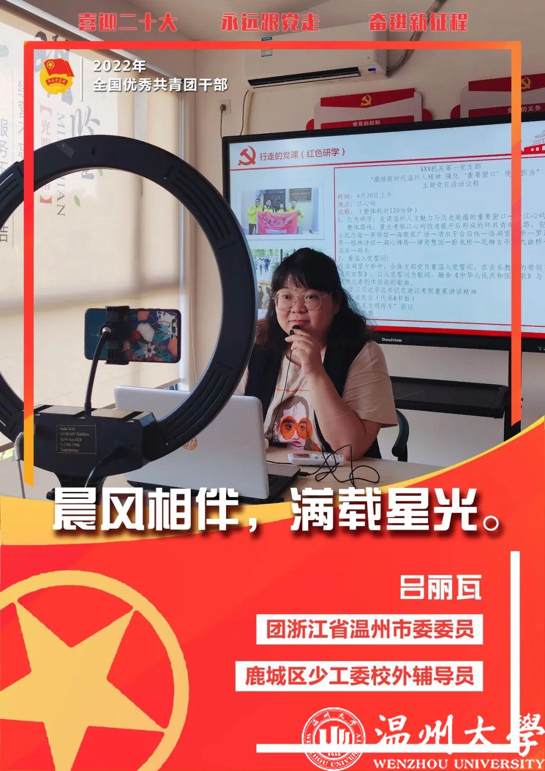 丽瓦作为温州市和乐社会工作服务中心总干事,她带领和乐社工团支部订制青年思政课50多场,运用 “结构化读书会”“艺术党课”模式引领青少年政治思想。她在各级院校积极发起“爱满星河”倡议,4年10多万青少年接力为自闭症儿童折星星;发起关爱最美橙色“逆行”者活动,3000余名青少年筹集20万物资定向捐赠高危领域环卫工人。她发起“青近非遗”、“行走的党课”活动,让青少年认识鹿城、传承发展;联合创设的“有温度”少先队员课后家园工作站,接待留守青少年超5万人;发起的“两代人共成长”计划为超3000户新居民家庭提供亲子阅读指导。