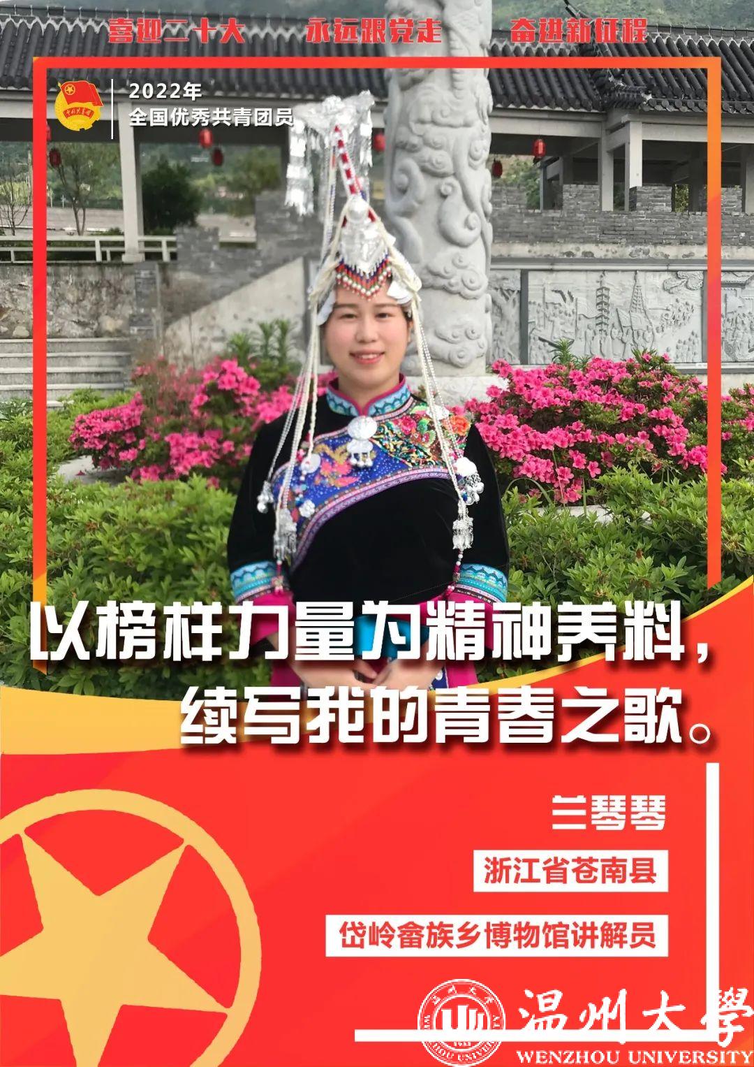 兰琴琴来自苍南县岱岭畲族乡,是一名土生土长的畲族姑娘。她担任苍南县岱岭乡富源村团支部书记的同时,还兼任苍南畲族博物馆讲解员,致力于通过为来访宾客讲解畲族文化习俗,大力促进少数民族文化交流。作为一名平凡的90后“山哈青年”,她关爱畲乡青少年的成长,也喜爱做一名推动畲族文化传承与发展的青年团干部。她通过持续组织开展系列团员活动,帮助畲乡青少年树立正确的世界观、人生观和价值观,并帮助青少年学习畲族文化,一同做畲族传统文化的守护者。