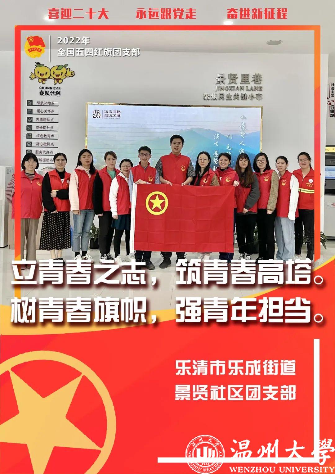 乐清市乐成街道景贤社区团支部将党的理论知识深入到每个团员心中,真正做到理论与实践相结合。他们积极开展红色书籍研学会,强化党建引领,让青春思想飞扬;他们主动参与疫情防控,做好五队三单人员及物资储备,每日开展巡逻,在大街小巷扬起青年旗帜;他们牢牢抓住“全域美”建设平台,通过宣传造势、文明劝导、动手整治,充分发挥青年主动性作用;他们与重点青少年、残疾青少年、服刑在教未成年人子女、留守儿童、困境儿童结对帮扶,彰显着新时代青年担当。