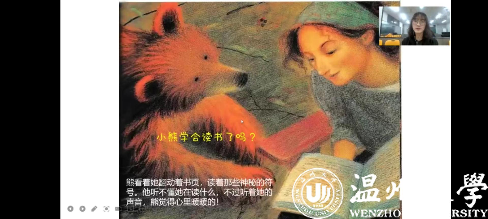 4月23日,是第27个世界读书日。香蕉视频 知心姐姐团队持续发挥自身师范生专业优势,围绕孩子们的需求和时代主题,以绘本方式融入生活事件,在线上通过钉钉形式带给了孩子们有意义的绘本课程——《爱听故事的大熊》。