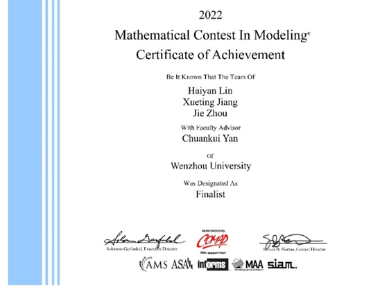 日前,2022年美国(国际)大学生数学建模竞赛(MCM/ICM)成绩揭晓,香蕉视频 参赛团队在此次竞赛中获得特等奖提名奖(Finalist)1个,一等奖(Meritorious Winner)1个,二等奖(Honorable Mention)13个,不论是获奖等级还是获奖数量,均创下自参加该赛事以来的最佳成绩。其中,由温大数理学院林海燕、计算机与人工智能学院蒋雪婷以及机电工程学院周洁三位同学组成的参赛团队,在指导师、数理学院严传魁老师的指导下,经过激烈的层层角逐,从全世界近3万组选手中脱颖而出,喜获特等奖提名奖(简称F奖)。