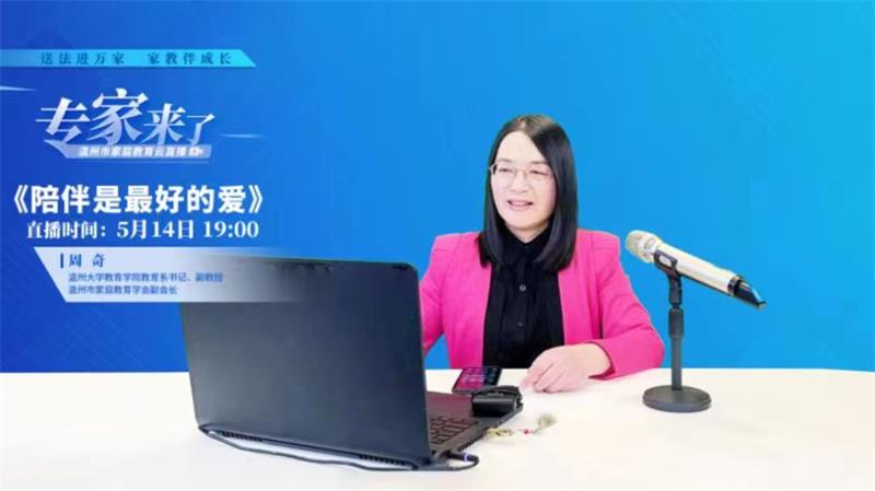 为深入贯彻习近平总书记关于注重家庭家教家风建设重要论述,将“重视家庭文明建设,努力使千千万万个家庭成为国家发展、民族进步、社会和谐的重要基点”重要精神落到实处,有力推动《中华人民共和国家庭教育促进法》宣传实施,2022年5月14日,在全国首个家庭教育宣传周期间,香蕉视频 教育学院教育系党支部书记、副教授、硕士生导师,香蕉视频 家庭教育研究院巾帼文明岗岗长、香蕉视频 家庭家教家风讲师团团长、浙江省教育学分会副会长、浙江省家庭教育学会理事、温州市家庭教育学会副会长周奇做客“专家来了”温州市家庭教育云直播,开展《陪伴是最好的爱》家庭教育公开指导课。本次直播以“送法进万家 家教伴成长”为主题,旨在弘扬传承中华民族家庭美德,树立良好家风,推动形成家庭文明新风尚。整场直播吸引了12.5万人次观看,并获得2万多的网友点赞。