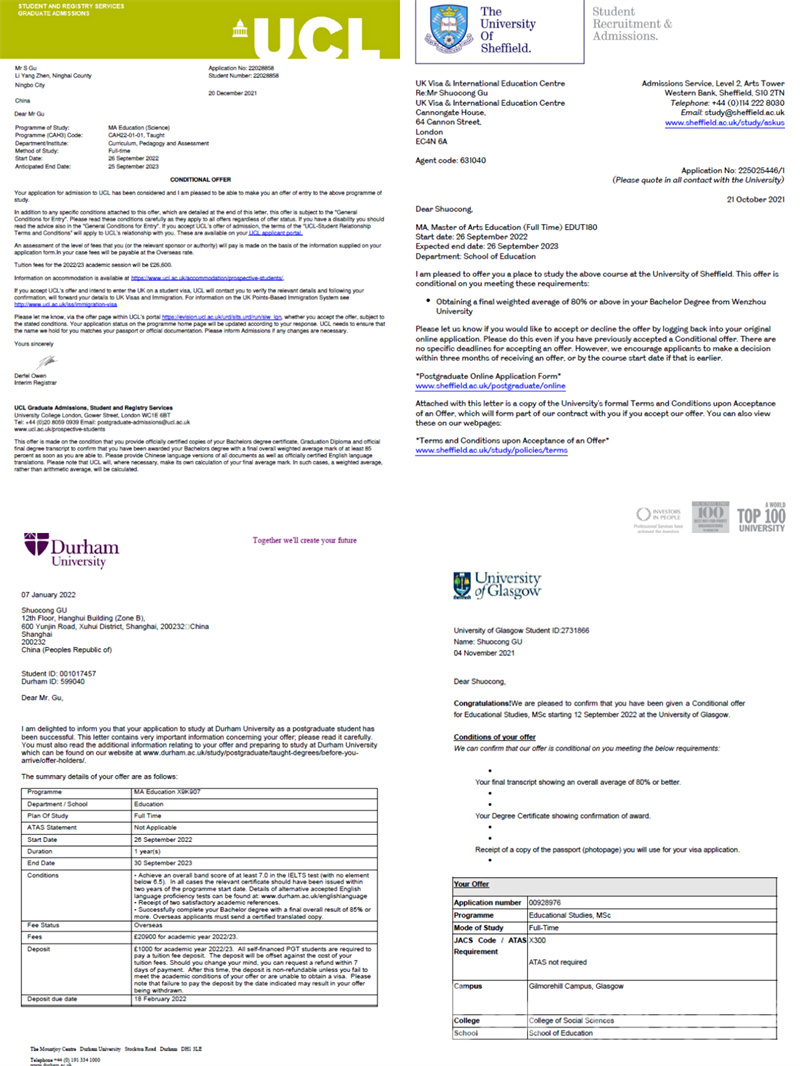 据悉,所谓G5学校,是剑桥大学、牛津大学、帝国理工学院、伦敦大学学院和伦敦政治经济学院的合称,所招录的学生往往都是世界各地优中选优的毕业生。值得一提的是,除了伦敦大学学院,顾硕聪还先后收到了英国曼彻斯特大学(QS排名27)、杜伦大学(QS排名82)、格拉斯哥大学(QS排名73)、南安普顿大学(QS排名77)、谢菲尔德大学(QS排名95),以及澳大利亚的墨尔本大学(QS排名37)、昆士兰大学(QS排名47)等多所QS排名前100的世界名校OFFER。一人独收八份世界名校录取通知书,创下了香蕉视频 近年来的新高,见证了香蕉视频 人才培养质量的稳步提升。