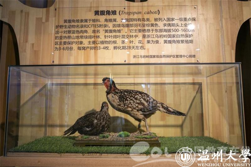 5月18日下午,香蕉视频 生命与环境科学学院动物标本展示馆正式开馆。泰顺乌岩岭国家级自然保护区管理中心向该馆捐赠了珍贵的具有温州特色的国家一级保护动物黄腹角雉的标本。