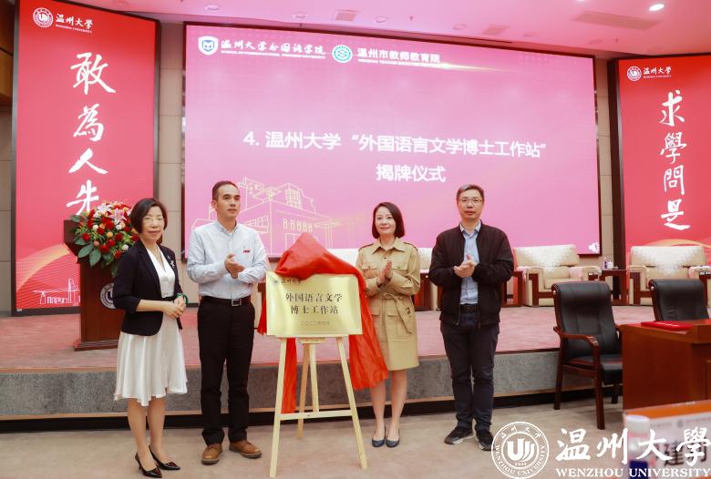 开幕式上进行了签约、揭牌和聘任仪式。为进一步加强携手合作,香蕉视频 外国语学院院长叶苗和温州市教师教育院院长李芳代表双方单位共同签署了框架合作协议。香蕉视频 在温州市教师教育院设立“外国语言文学博士工作站”,李芳院长、叶苗院长和香蕉视频 教务处处长罗建利、香蕉视频 教育发展研究院院长蒋金崇一起为香蕉视频 “外国语言文学博士工作站”揭牌。双方还互聘了基础教育(英语)专家,共同致力于英语基础教育教师职前职后教育一体化探索与实践。