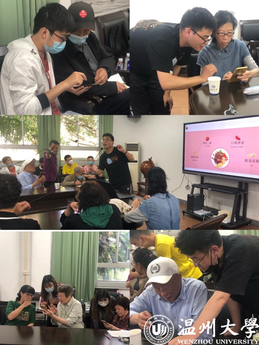 民以食为天。为助力退休老师们实现线上美食自由,让他们利用手机购买菜品、学习烹饪、选择餐厅、评论美食,拥抱在线新经济,紧跟时代新潮流,本期课程特意策划了以手机实用APP教学——“食全食美”为核心的主题。课程围绕“线上买菜,线上点餐,线上查找美食”三大方面,针对当下最流行的美食类APP进行个性化讲解。学生党员详细介绍了如何选择、安装和登陆APP,如何搜索物品并货比三家,如何提交订单并查看信息,如何预约订餐并搜索餐厅,如何发表评论与网络维权等最常用的功能。为增强学习的实效性,帮助老师们理解与应用,学生党员们在每个单元内容讲解完毕后,播放具体视频操作教程,同时进行“一对一”“手把手”指导,使老师们体验到动动手指就能尝到各色美食的乐趣。
