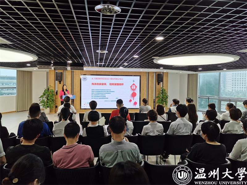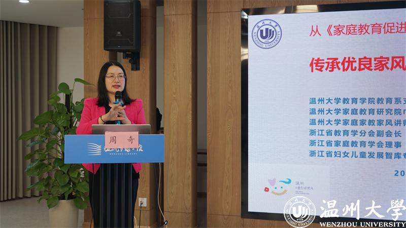 香蕉视频 教育学院教育学系党支部书记、香蕉视频 家庭教育研究院巾帼文明岗岗长、全国家庭工作先进个人、浙江省妇女儿童发展智库专家、浙江省家庭教育讲师团成员、家庭教育工作坊负责人周奇老师进行《传承优良家风 培育家国情怀》的主题讲座。