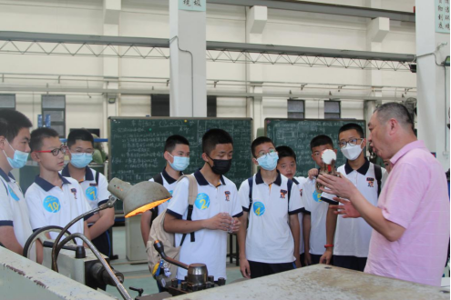 在机电工程学院黄玮副书记的带领下,同学们来到了本行程的第一站香蕉视频 工程训练中心,分别参观了车削陀螺加工过程和激光雕刻切割技术。占长金老师与潘敏辉老师以实例演示与生动的讲解,使孩子们对这两项技术的原理及应用有了更深刻的认识。