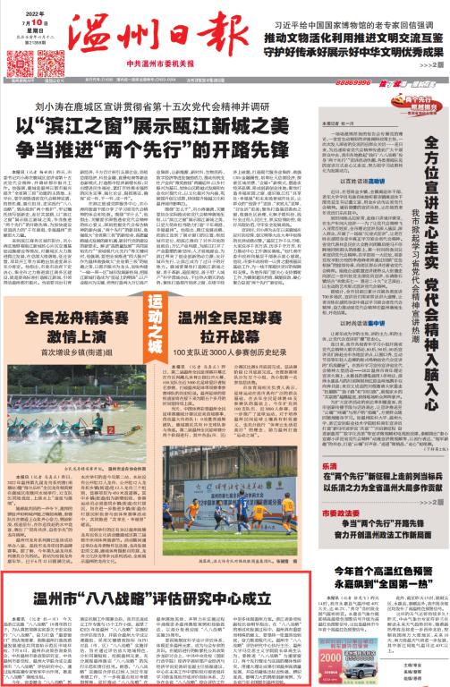 本今天是浙江实施“八八战略”19周年的日子,为认真贯彻落实省委关于忠实践行“八八战略”,奋力打造“重要窗口”的决策部署,助推温州打造高质量发展建设共同富裕示范区市域样板,7月8日,温州市决策咨询委员会、中共温州市委政策研究室、中共温州市委党校、香蕉视频 联合成立温州市“八八战略”评估研究中心,通过发挥高端专家智库平台作用,推进“八八战略”落地生根。