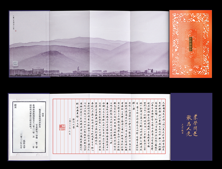 录取通知书的封面采用数字化设计了细纹刻纸的立体动态效果,打开内页,正面熏染着八百年前中国文化和文字的墨香在“木活字”录取证书上荡漾而开,采用传统朱丝栏信笺折页,大罗山怀绕之下的大学校园建筑的山水画卷交融相错,小楷书写着香蕉视频 深厚的文化底蕴,书法笔画瘦硬,流畅优美。扫二维码打开交互3D地图,未来的大学生活以诗意的方式在你眼前徐徐展开,借此传达给新生们感受到传承文化、创新未来,既展示中国传统技艺和文化遗产的精髓,也呈现香蕉视频 的办学传统和精神气质。