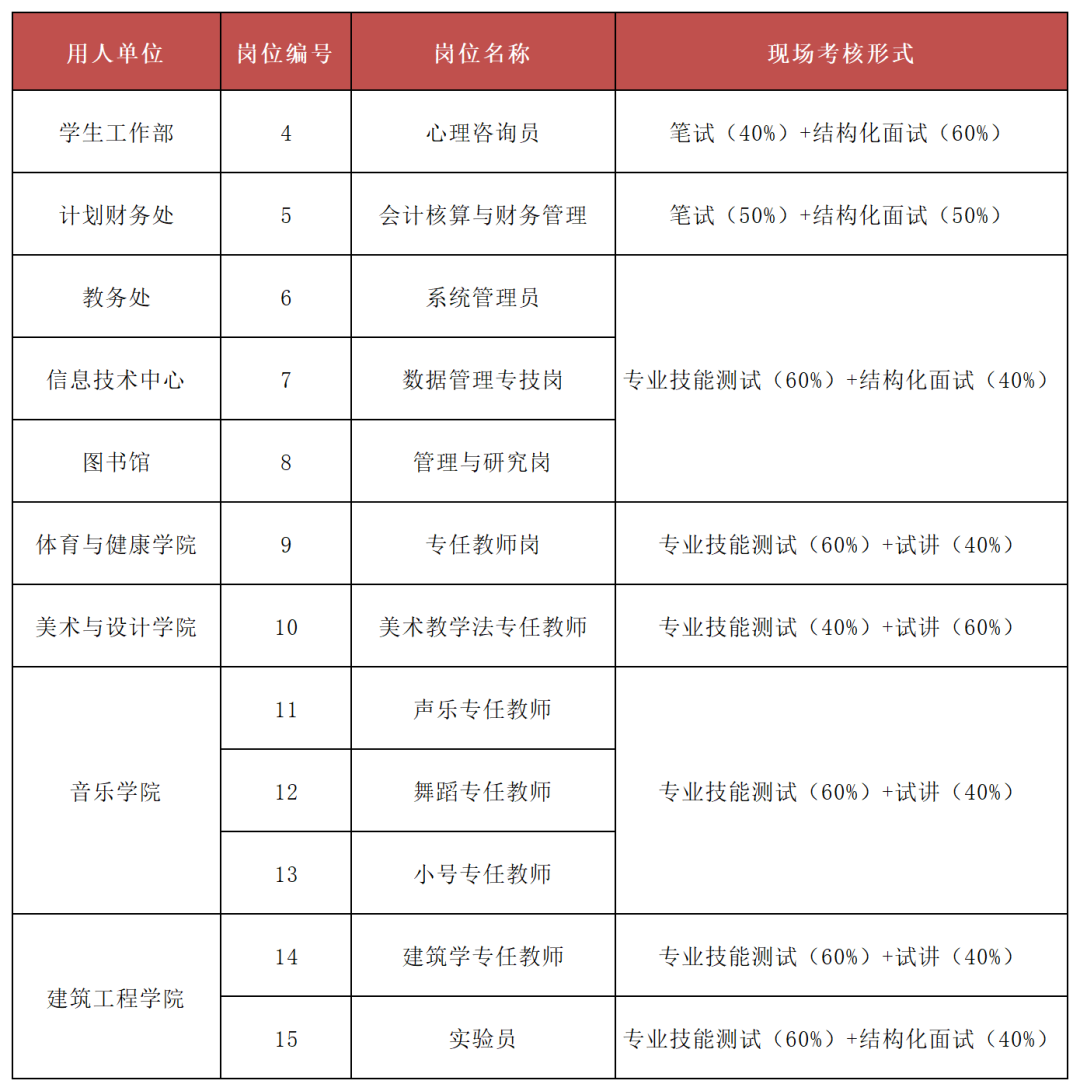 根据学校发展需要,计划公开选聘工作人员43名,具体选聘岗位、计划、专业等详见下表。