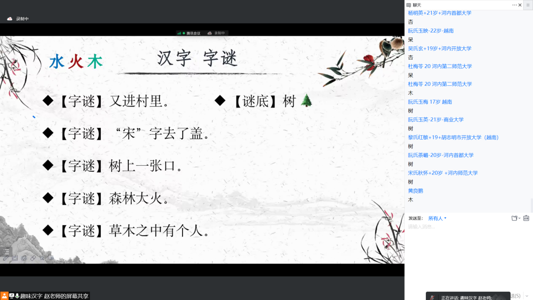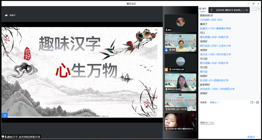 在趣味汉字课程中,赵银银老师采用“同族字”教学的方法,以“心”和“金木水火土”五行相关汉字为纲,既重视学生已有的语言、文化基础,又进行适当的拓展与延伸,向学员们讲解了汉字的意义与用法。在讲解“忘、忙、思、想、情、息”等“心”族字时,赵老师引入了成语、古诗词、中国传统节日、文化典籍等多种元素。赵老师通过《战国策》中“亡羊补牢”的成语引出了与“心”有关的汉字“忘”,帮助学员们清晰地理解“忘”字的涵义;通过“红豆生南国,春来发几枝。愿君多采撷,此物最相思”的美好意境,帮助大家感受意味深长的“情”与“思”;通过“云想衣裳花想容,春风拂槛露华浓”,帮助学员在春风满纸、花光满眼中明白汉字“想”。
