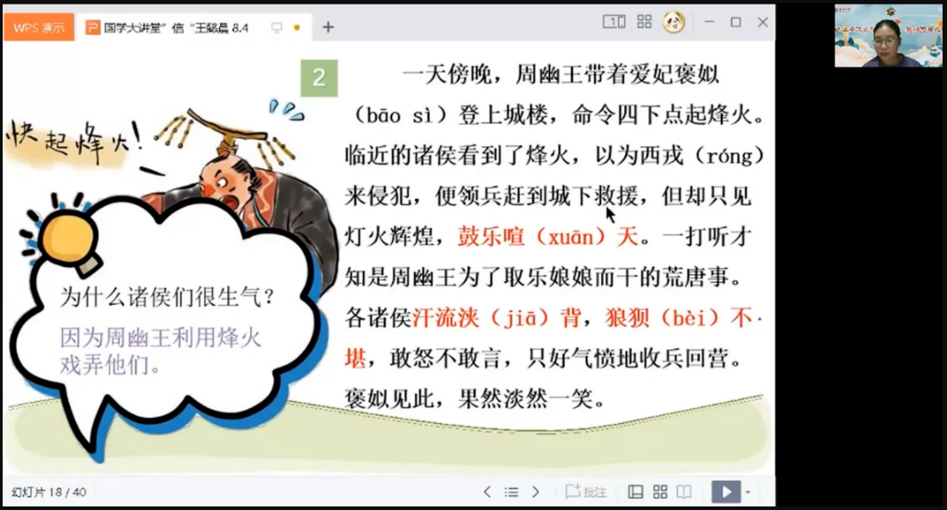 王老师通过周幽王烽火戏诸侯与商鞅立木为信的对比,引出“言必信,行必果”等格言警句。烽火戏诸侯导致帝王无信,并最终自食其果、身死国亡;商鞅立木为信、一诺千金,因而变法成功,国富民强。学员们通过故事,进一步体会到“信”对于一个人安身立命、乃至对于国家兴衰存亡的重要性。