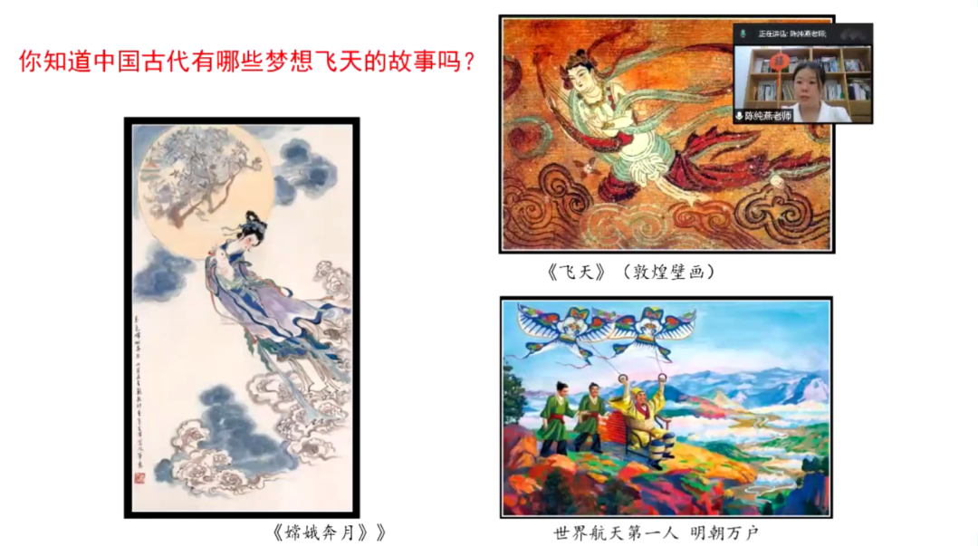 在《学画中国画——星辰大海 向梦而生》的课堂上,温州市教坛新秀、一级教师、来自香蕉视频 城附属学校的陈纯燕老师以《嫦娥奔月》《飞天》(敦煌壁画)等的画作为引,向海外华裔青少年们展示了中国古代人们对于航天梦的憧憬与追求,并介绍了中国航天事业的不断发展与各项重大突破,彰显了中华民族对于“蓝天梦想”的不懈追求与拼搏精神。