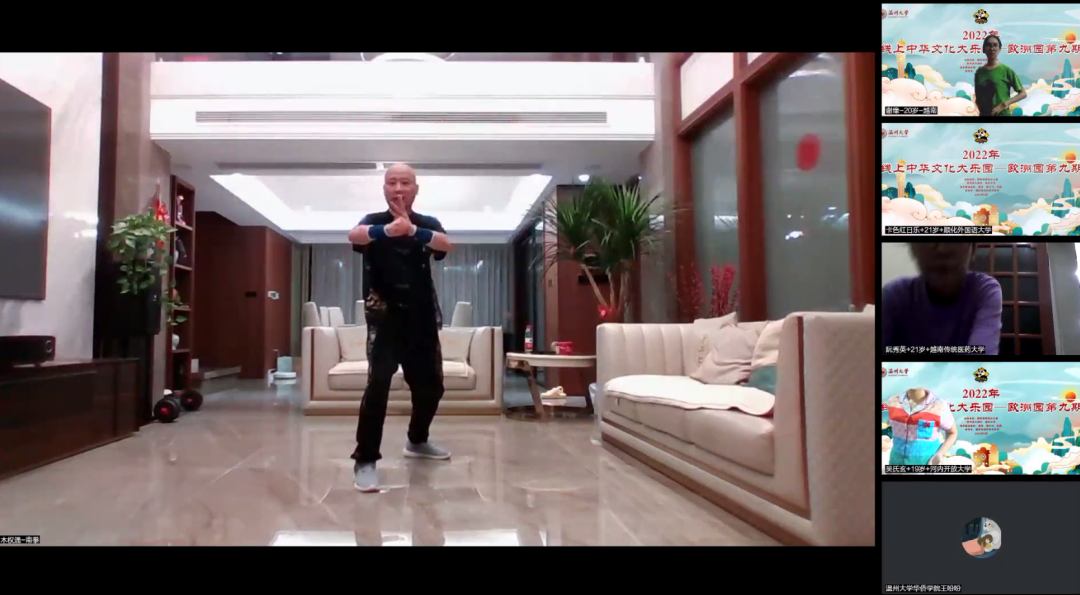 在《温州南拳》的课堂上,南拳大师木权通正耐心地示范、分解动作要领,带领海外华裔青少年们学习中国武术——南拳。木权通老师拳拳生风、掌出如龙,让华裔青少年们大开眼界。学员们跟着木老师一招一式地练习南拳基础拳法与棍法的动作要领,并在屏幕前踊跃展示练习成果,在云端与同学们交流练习心得与体会。甚至在课程结束后,仍能看到学员们在网课平台上反复练习南拳动作的身影。