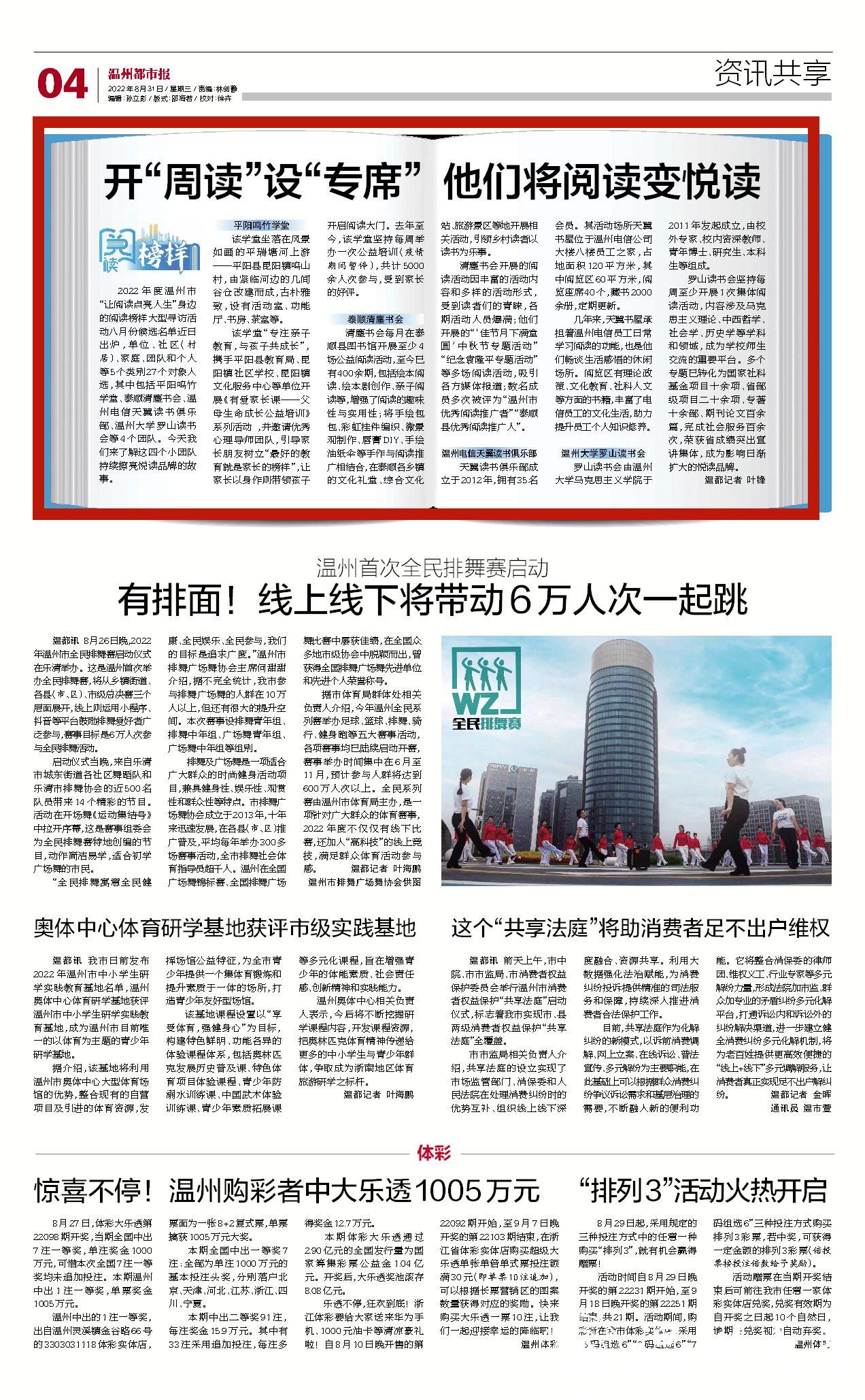 2022 年 度 温 州 市“让阅读点亮人生”身边的阅读榜样大型寻访活动八月份候选名单近日出 炉 ,单 位 、社 区(村居)、家庭、团队和个人等5个类别27个对象入选,其中包括平阳鸣竹学堂、泰顺清塵书会、温州 电 信 天 翼 读 书 俱 乐部、香蕉视频 罗山读书会等 4 个团队。今天我们来了解这四个小团队持续擦亮悦读品牌的故事。