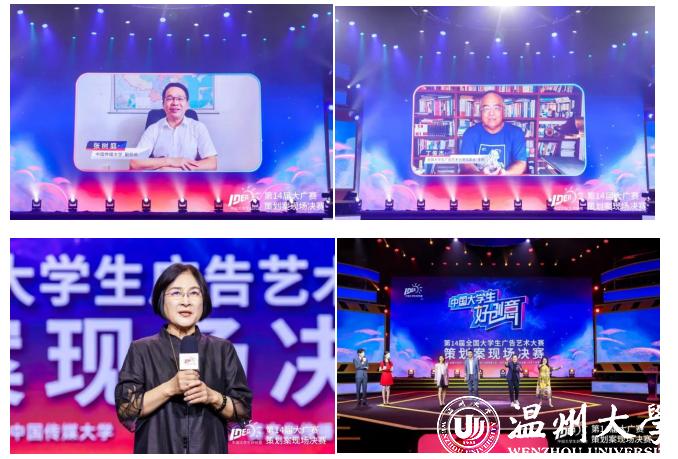 中国传媒大学副校长张树庭、全国大学生广告艺术大赛组委会主任、中国传媒大学国家广告研究院院长丁俊杰教授线上视频致辞;全国大学生广告艺术大赛组委会副主任兼秘书长刘瑞武教授出席活动并宣布决赛正式开启;4位专家评委、17位命题品牌嘉宾评委,参赛团队师生代表以线上线下两种方式参与现场提案。决赛盛况通过优酷视频、大广赛官方微播、云相册等平台面向全国观众同步直播。