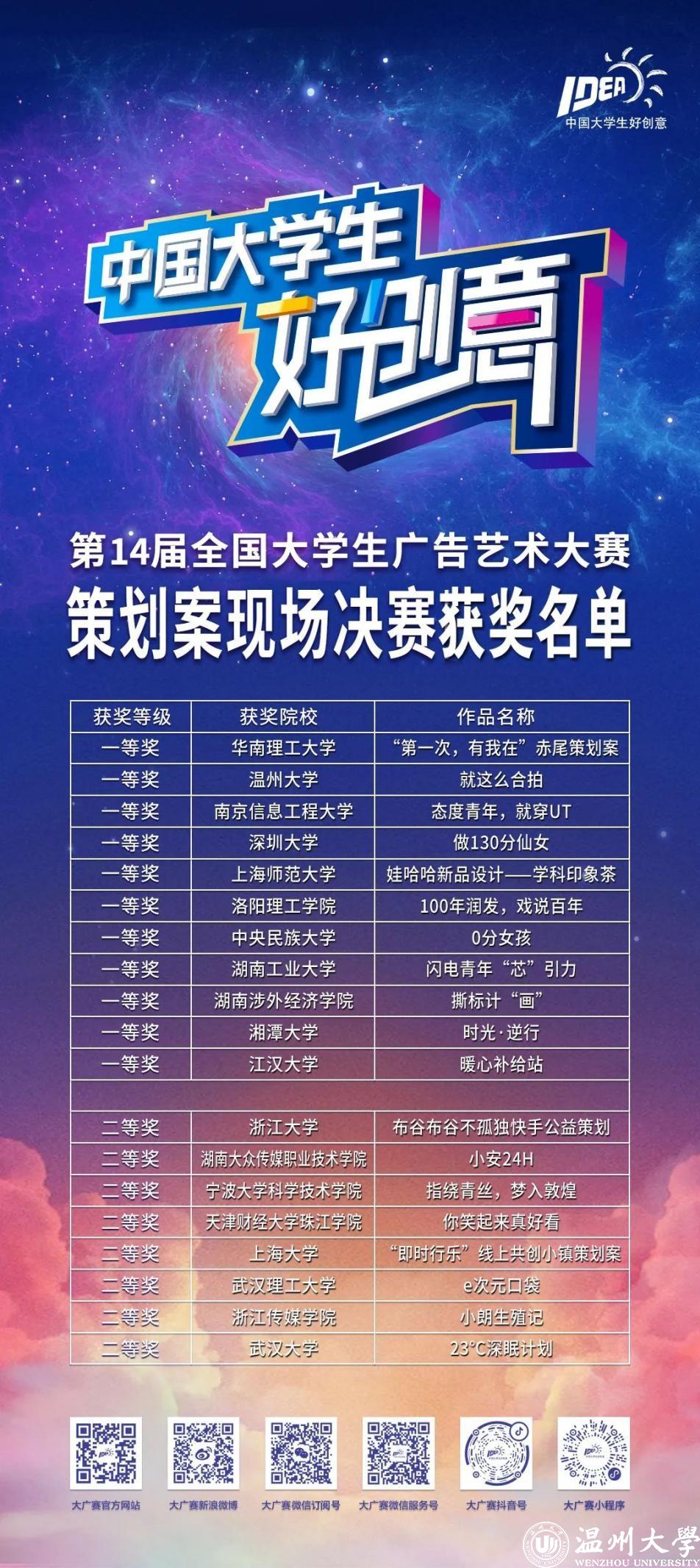 一天半的激烈比拼,万众期待的比赛结果终在18日揭晓:以华南理工大学朗圣药业命题《“第一次,有我在”赤尾策划案》为代表的 11件作品荣获一等奖,浙江大学快手命题《布谷布谷不孤独快手公益策划》等8件作品荣获二等奖;南京信息工程大学的刘鼎同学获得最佳口才奖,湖南大众传媒职业技术学院的谢思同学获得最佳表现个人奖,华南理工大学获得了全场最佳表现团队奖。