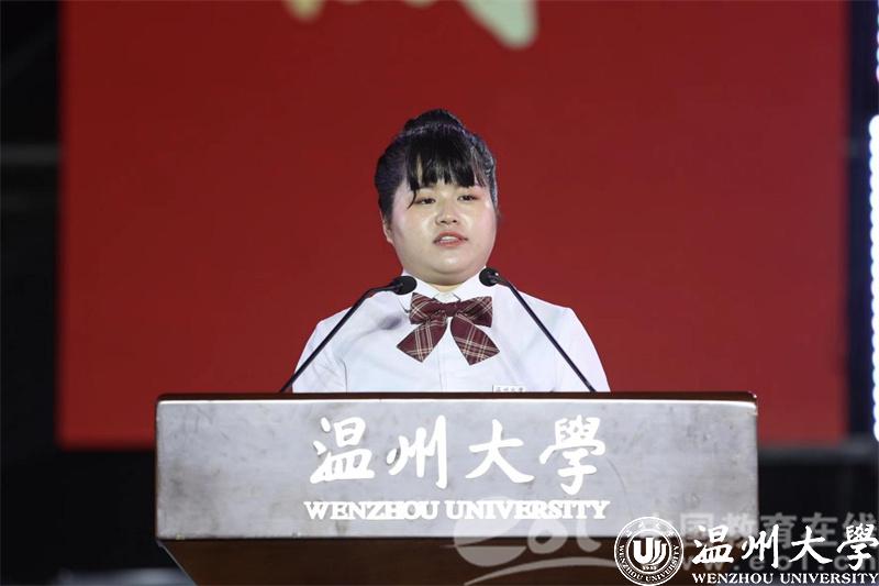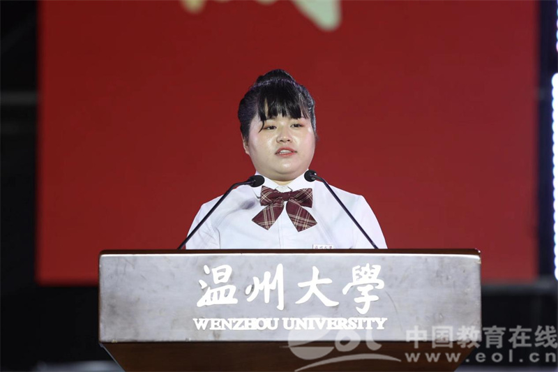 学校首届博士研究生胡海燕作为研究生新生代表发言。她表示被温大雄厚的学科科研实力深深吸引,结合学习科研感悟向新生发出无愧温大“厚培德本、深濬智源”的优秀传统,“努力成为一名为国家发展、民族振兴奉献力量的温大人”的青春倡议。