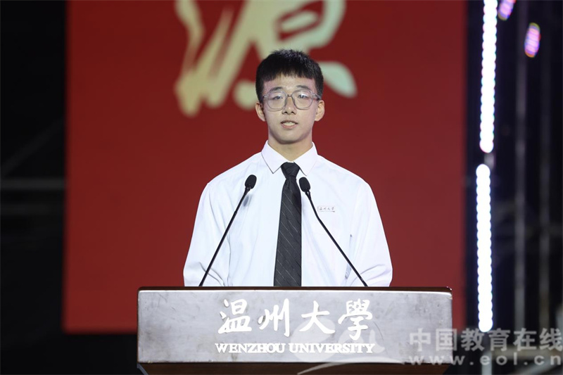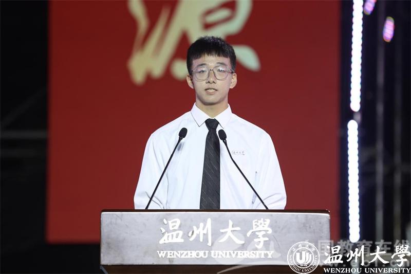本专科生代表胡瑞祥同学发言。他号召全体新生同学在梦想力量蓬勃向上、奉献声音响彻云霄的温大校园中一同书写青春奋斗的美好篇章。