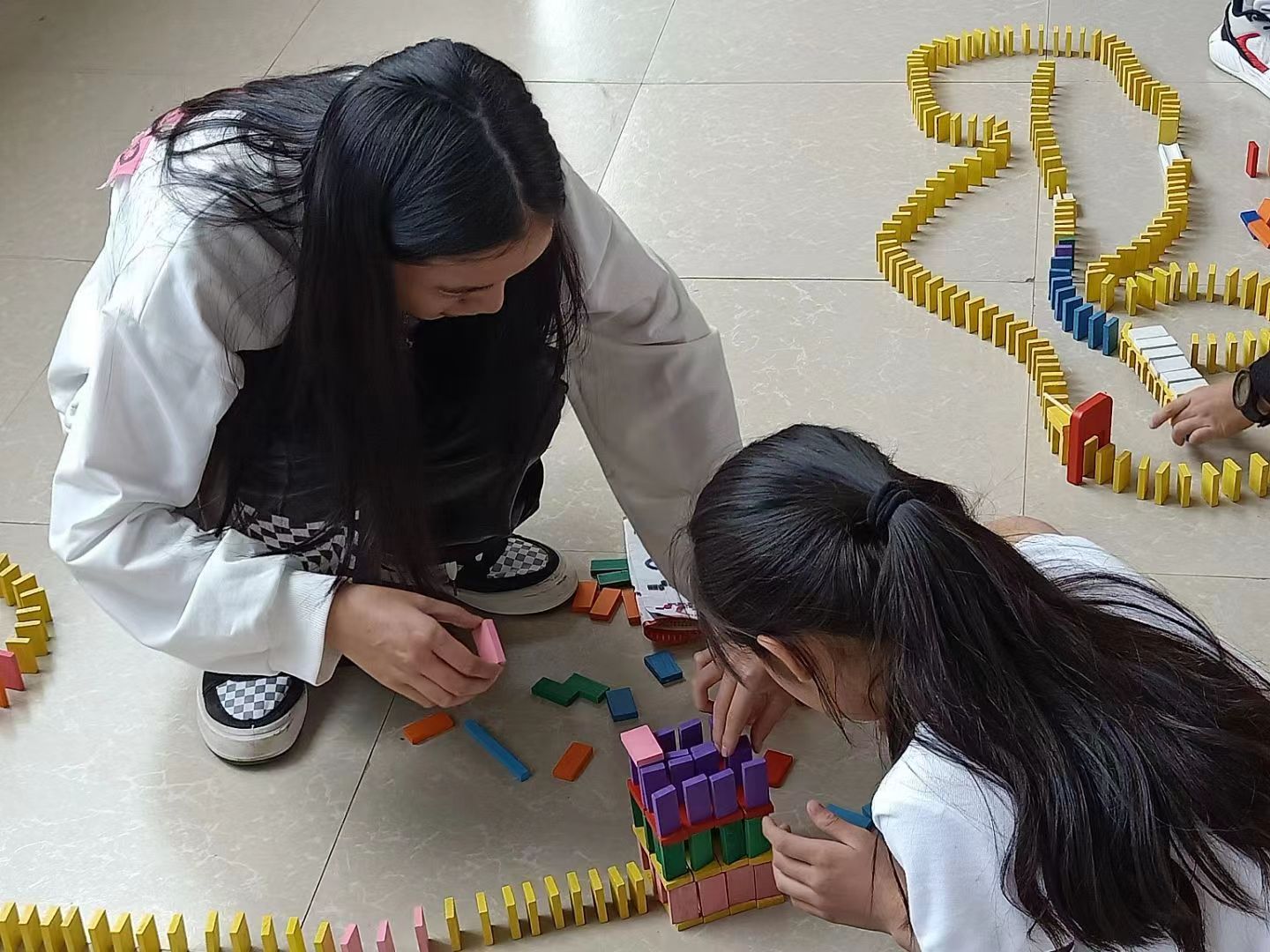 “123开始!”,小朋友手指一动,刷的一声多米诺骨牌应声倒下,课堂上又传来的一阵欢声笑语,课堂上,老师和学生们早已打成一片。这项具有香蕉视频 建筑工程学院的专业特色的公益课堂已经坚持了十年。