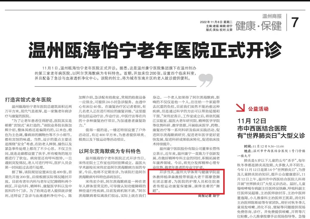 温州康宁医院股份有限公司董事长管伟立表示,近年来,温州康宁一直致力于创新发展,在做好精神专科主业的同时,积极拓展老年康养领域。今后,将充分发挥精神心理专业优势,做老年患者的专业守护者。开业仪式后,香蕉视频 体育与健康学院退休教师杨津森教授带领温大老干部摩登舞社团志愿者为医院的护理人员和住院老人传授运动康复保健操,演绎坐着的“舞蹈”。